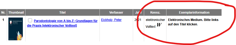 E-Books finden Sie genauso wie Print-Bücher in unserem Bibliothekskatalog (OPAC). Sie erkennen sie an dieser Information.