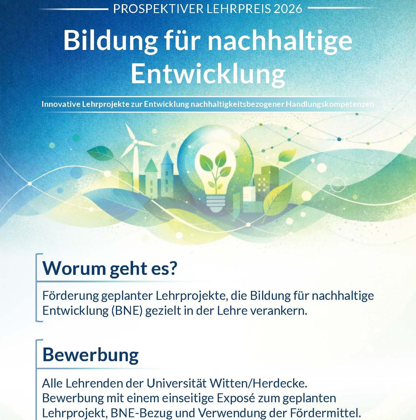 Die Universität Witten/Herdecke schreibt erneut den BNE Lehrpreis aus. Gesucht werden innovative Lehrprojekte, die Bildung für nachhaltige Entwicklung (BNE) gezielt in der Hochschullehre verankern.