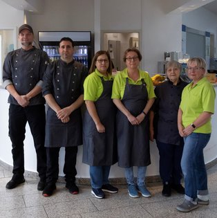 Wir sind ein diverses und sehr motiviertes Team. Was uns besonders auszeichnet, ist unser herzlicher Umgang mit Studierenden und anderen Gästen (aka „Schatzi“). Wir verstehen, dass die Zeit an der Hochschule herausfordernd sein kann, und wir möchten, dass die Cafeteria für euch ein Ort der Entspannung und des Genusses ist. Wenn nicht gerade Essensausgabe ist, haben wir eigentlich immer ein offenes Ohr für euch! Mit der Leitung durch Daniel Lammert kochen wir täglich mit viel Liebe und versorgen euch ab früh morgens mit Kaffee, Snacks und belegten Brötchen.