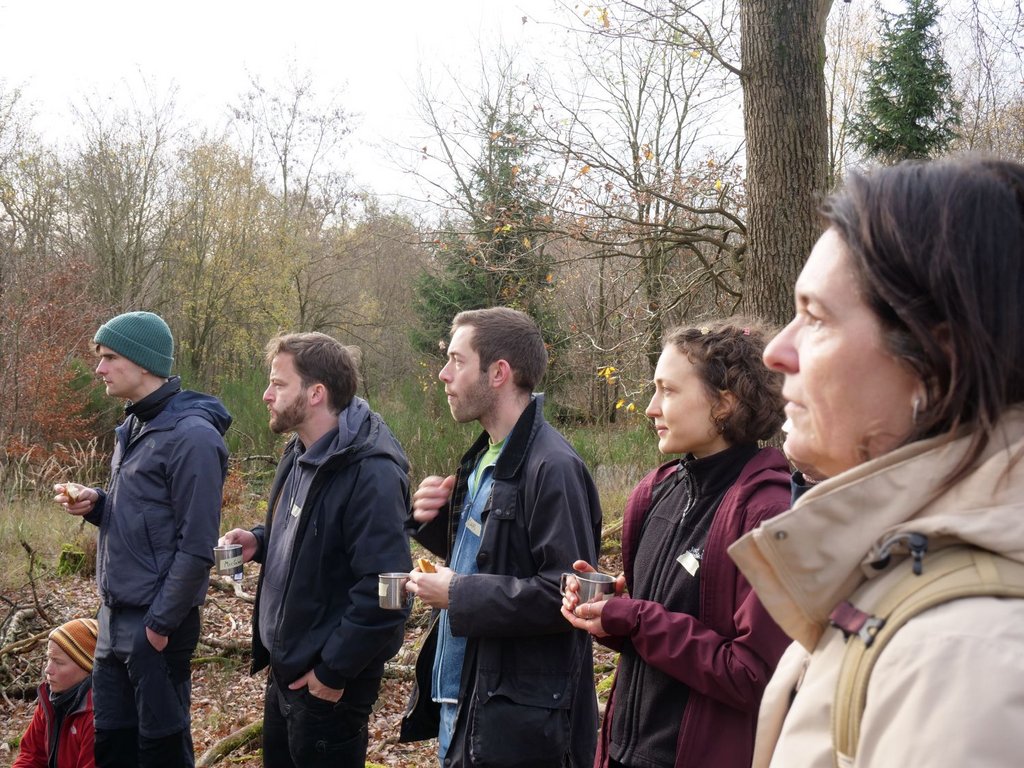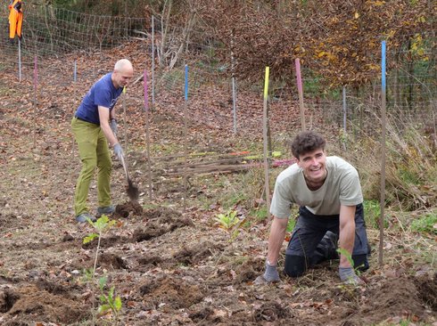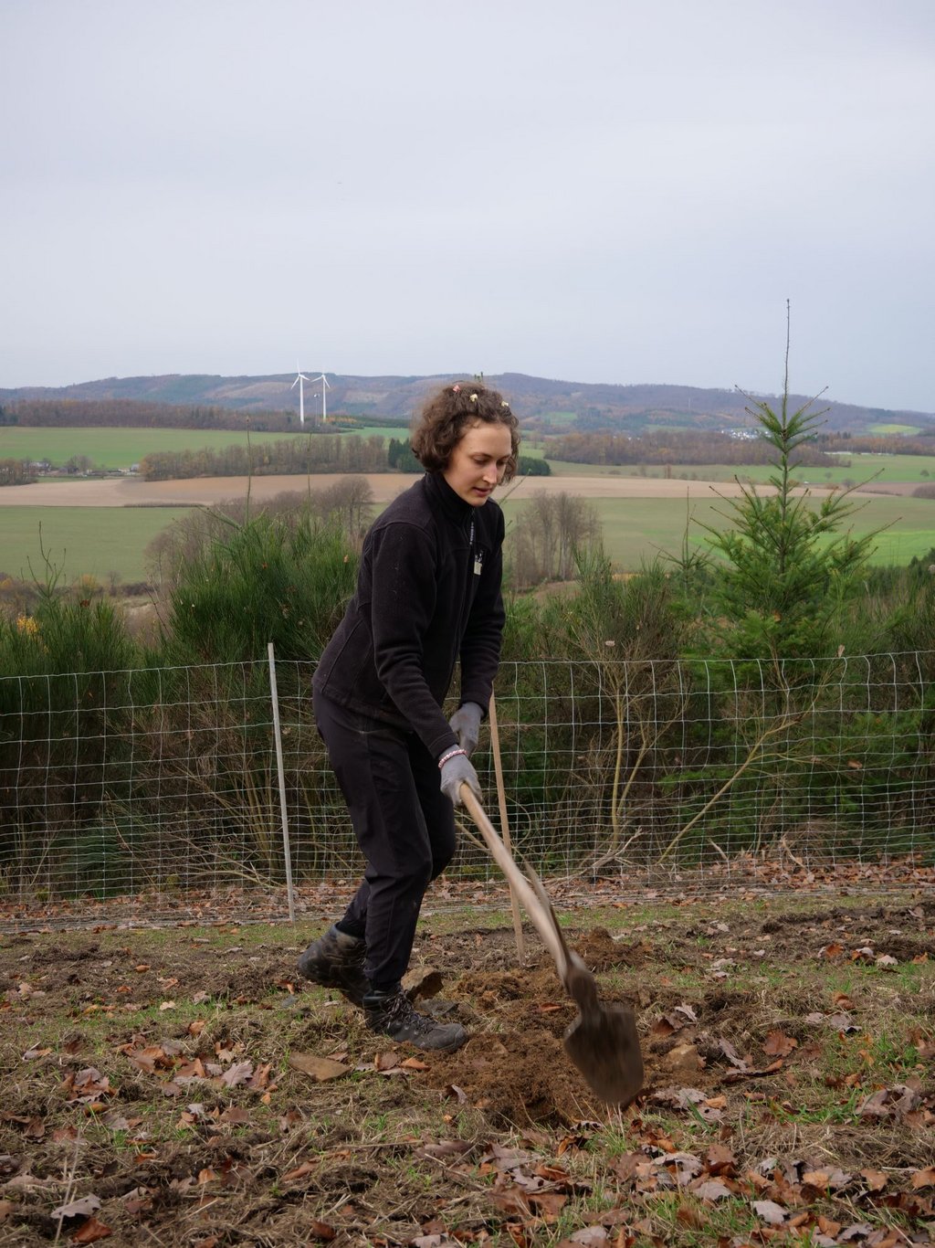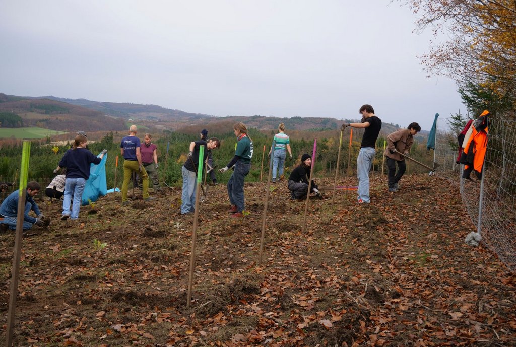Der erste Aktionstag fand am 14. November 2025 statt. Dann hieß es: Handschuhe an, Wiedehopfhaue in die Hand und raus in den Wald. Gemeinsam mit dem Bergwaldprojekt e. V. pflanzten wir in Neuenrade (Sauerland) 700 junge Traubeneichen. Die Eichen stammen aus Kroatien und kommen gut mit Trockenperioden zurecht. Angesichts der sinkenden Niederschläge und der zunehmenden Waldschäden in Deutschland wurde bewusst diese Art ausgewählt, da sie künftigen Klimabedingungen standhalten kann.