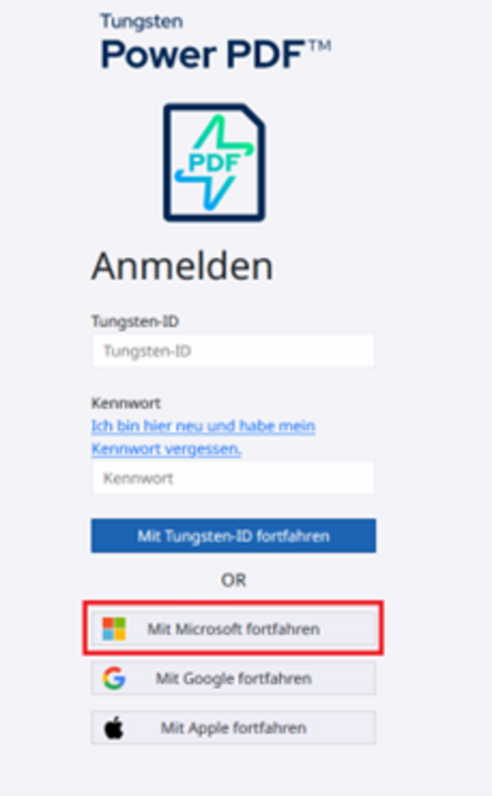 Beim ersten Start des Tungsten Power PDF Business öffnet sich ein Webbrowser mit der Anmeldemaske für das Programm.