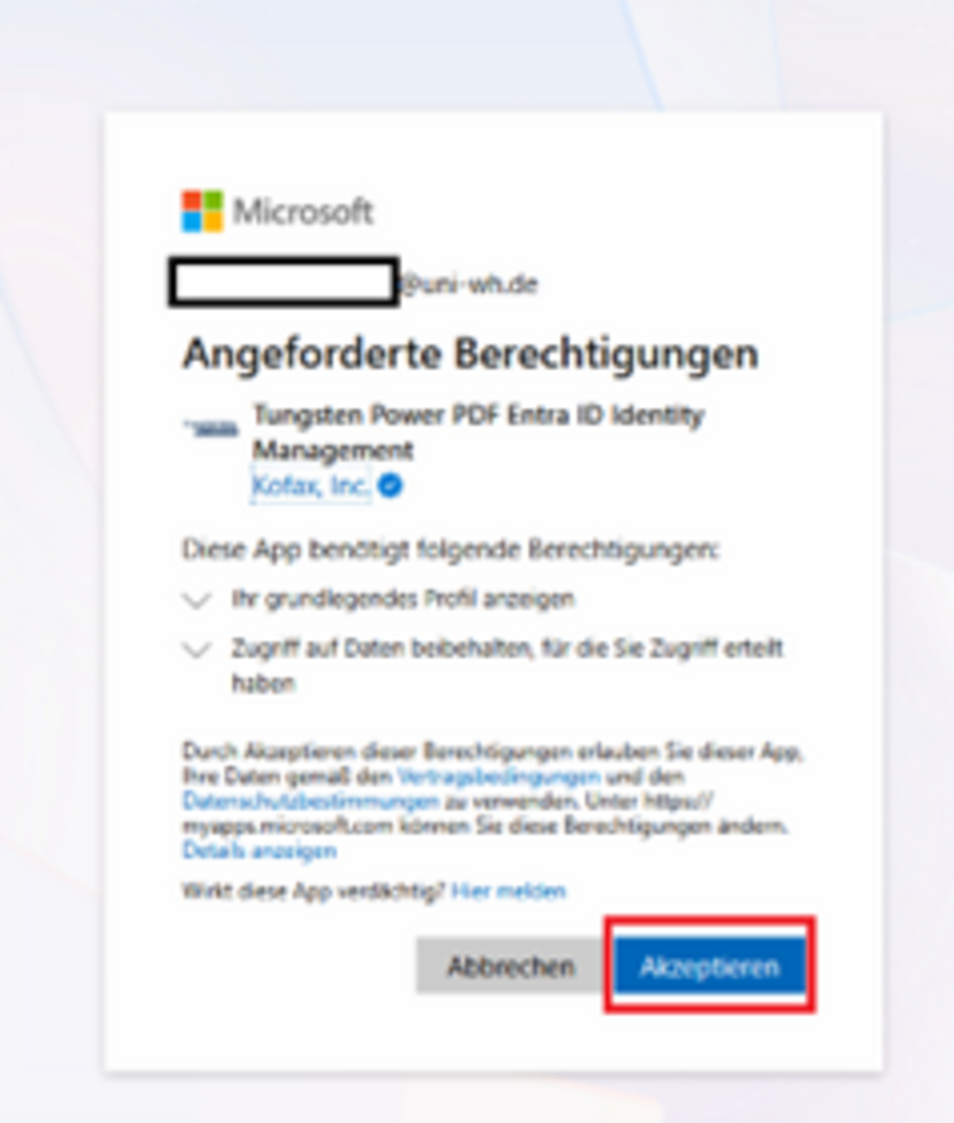 Bei der ersten Anmeldung an Tungsten Power PDF Business müssen Sie die „Angeforderte Berechtigungen“ akzeptieren.