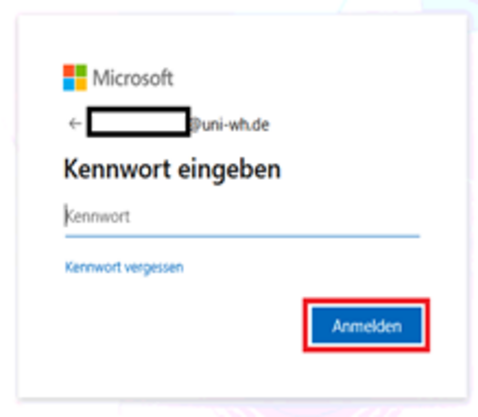 Daraufhin erscheint das untenstehende neue Fenster, in dem Sie dann bitte Ihr Passwort der UW/H eingeben.